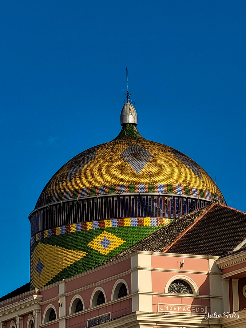 Além da representação de governo no interior do Teatro, na parte externa temos a Cúpula que em suas cores fazem alusão as cores da Bandeira do Brasil.