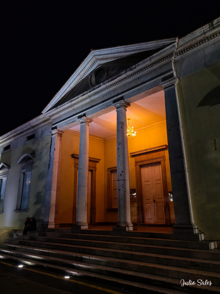 Os detalhes arquitetônicos da atual fachada do Teatro Amazonas são a mescla de vários estilos: o frontão curvo do barroco, colunas e simetria do classicismo e o eclético da cúpula.