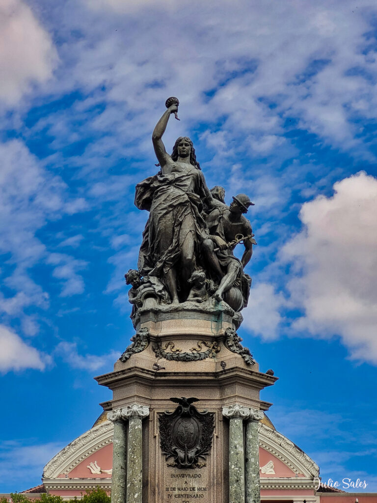 O monumento de Abertura dos Portos foi produzido na Itália, em 1900, com estilo barroco e contém quatro putti em cima de quatro barcas que compõem a simbologia aos quatro continentes com os quais os produtos amazônicos poderiam ser comercializados: América, Ásia, África e Europa. O putto da África está segurando uma preza de elefante, o da Europa segura um globo, o da Ásia segura um pote com fogo e o da América segura tabaco.