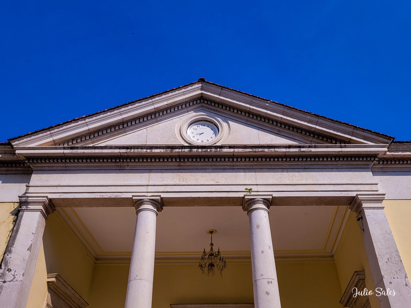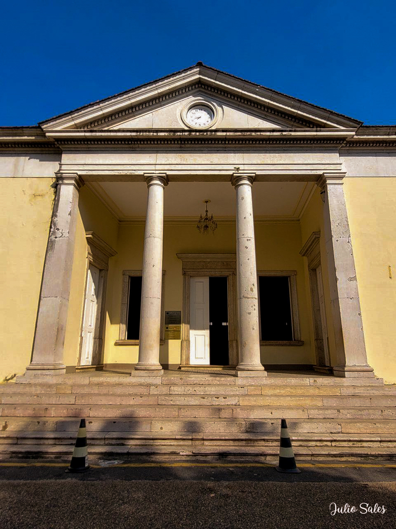 Como mencionado tem características neoclássica e é formado por apenas um andar. Sua fachada é composta por três sessões: no centro um pórtico com duas colunas e duas pilastras de ordem toscana, com um entablamento simples apresentando um frontão triangular vazado por um óculo onde se encontra um relógio; nas laterais vemos três janelas de cada lado, a janela central com um frontão triangular e as duas laterais com um frontão curvo.