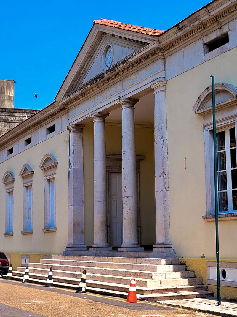 No alto do pórtico temos o típico frontão triangular de prédios neoclássicos. Frontões como esse são possíveis observar em outros prédios da cidade como o do Paço Municipal e das igrejas de São Sebastião e dos Remédios.