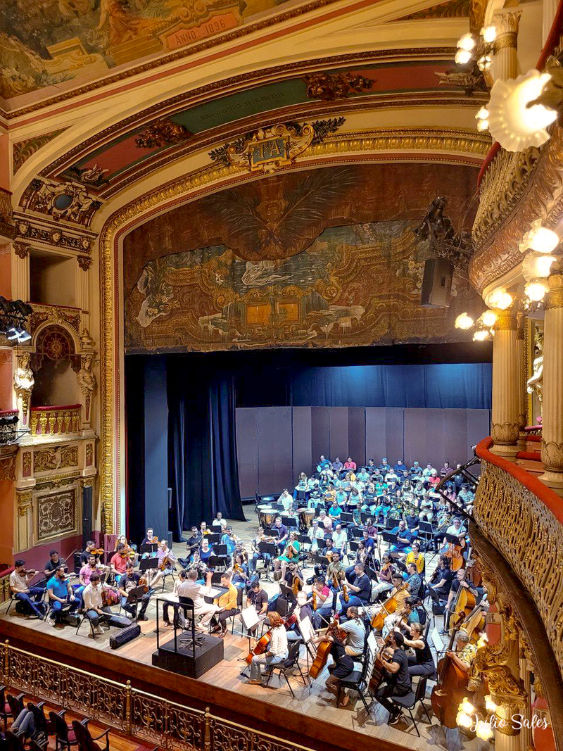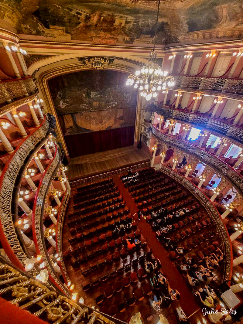 O salão tem forma de lira e é composto por um pavimento de plateia, um andar de frisas e três pisos de camarotes.