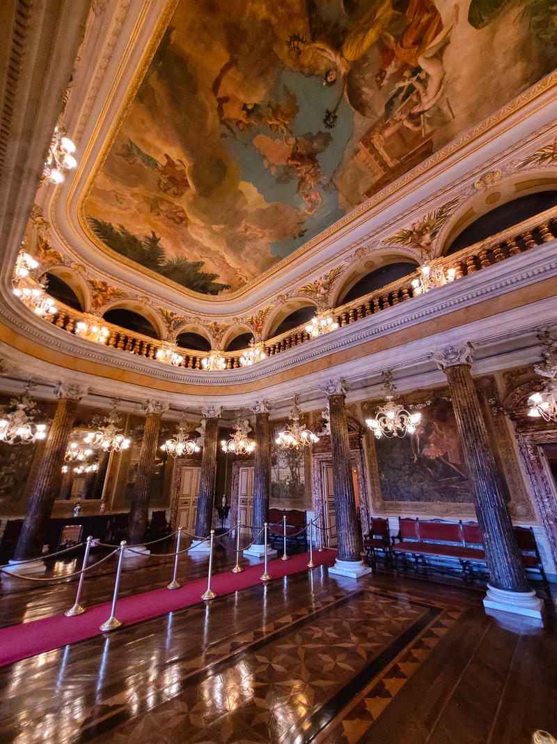 Ao redor do salão existem 16 colunas feitas de ferro e revestidas de gesso para imitar mármore. Entre as colunas há lustres de cristal de murano.