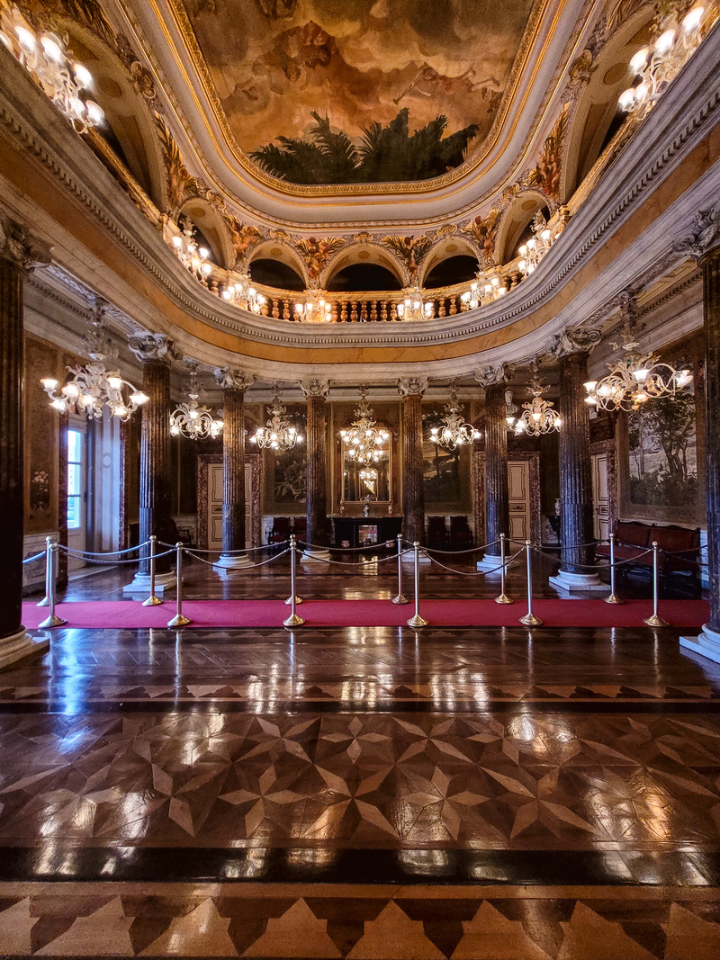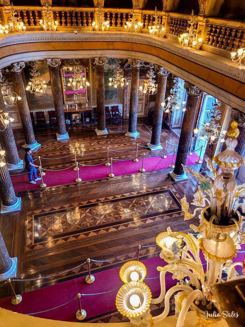 Ao redor do salão existem 16 colunas feitas de ferro e revestidas de gesso para imitar mármore. Entre as colunas há lustres de cristal de murano.